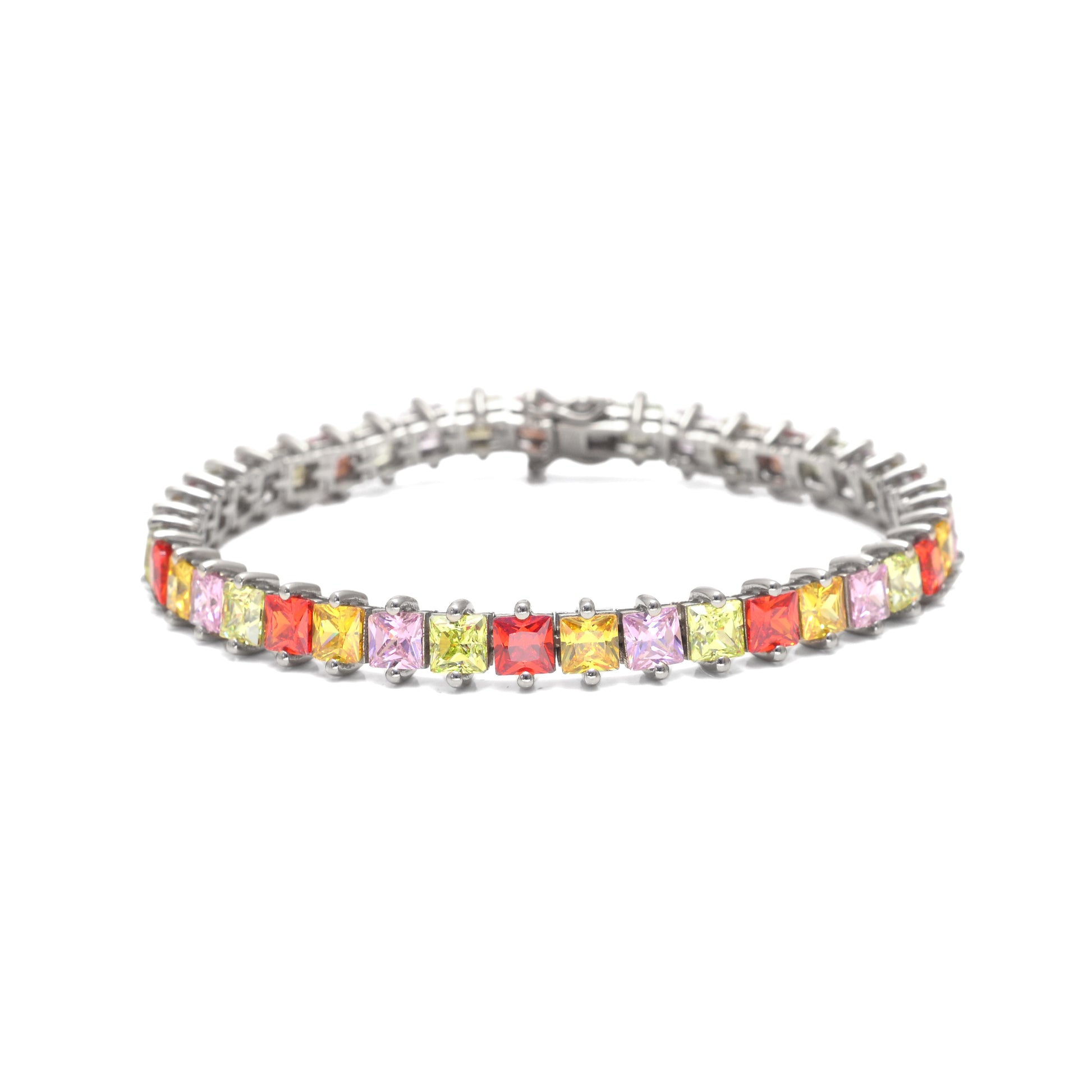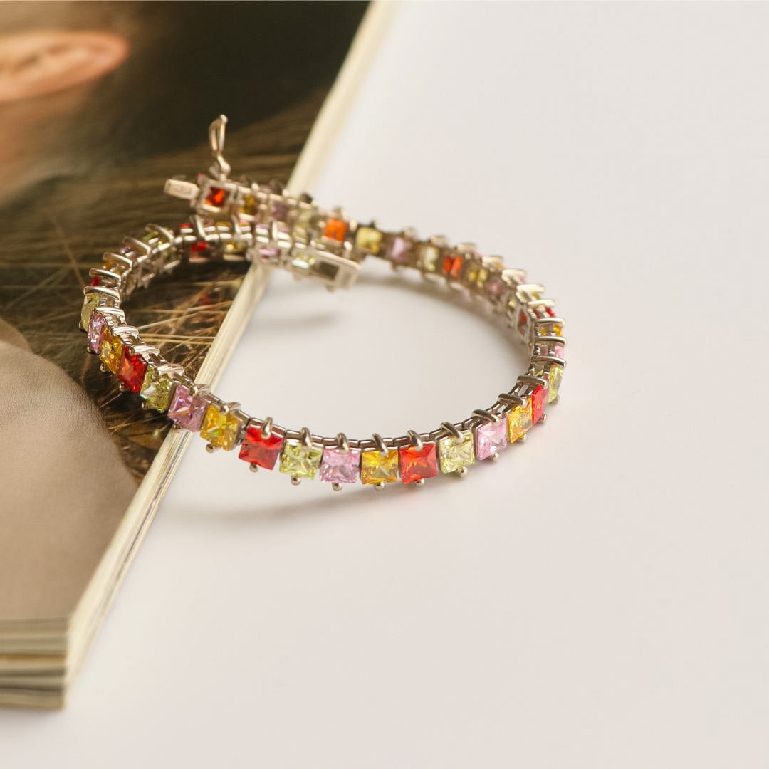 This sterling silver bracelet features a vibrant array of multicolour cubic zirconia stones, expertly set to enhance its brilliance and durability. Designed for both elegance and everyday wear, it offers a sophisticated sparkle that complements any outfit with subtle luxury.