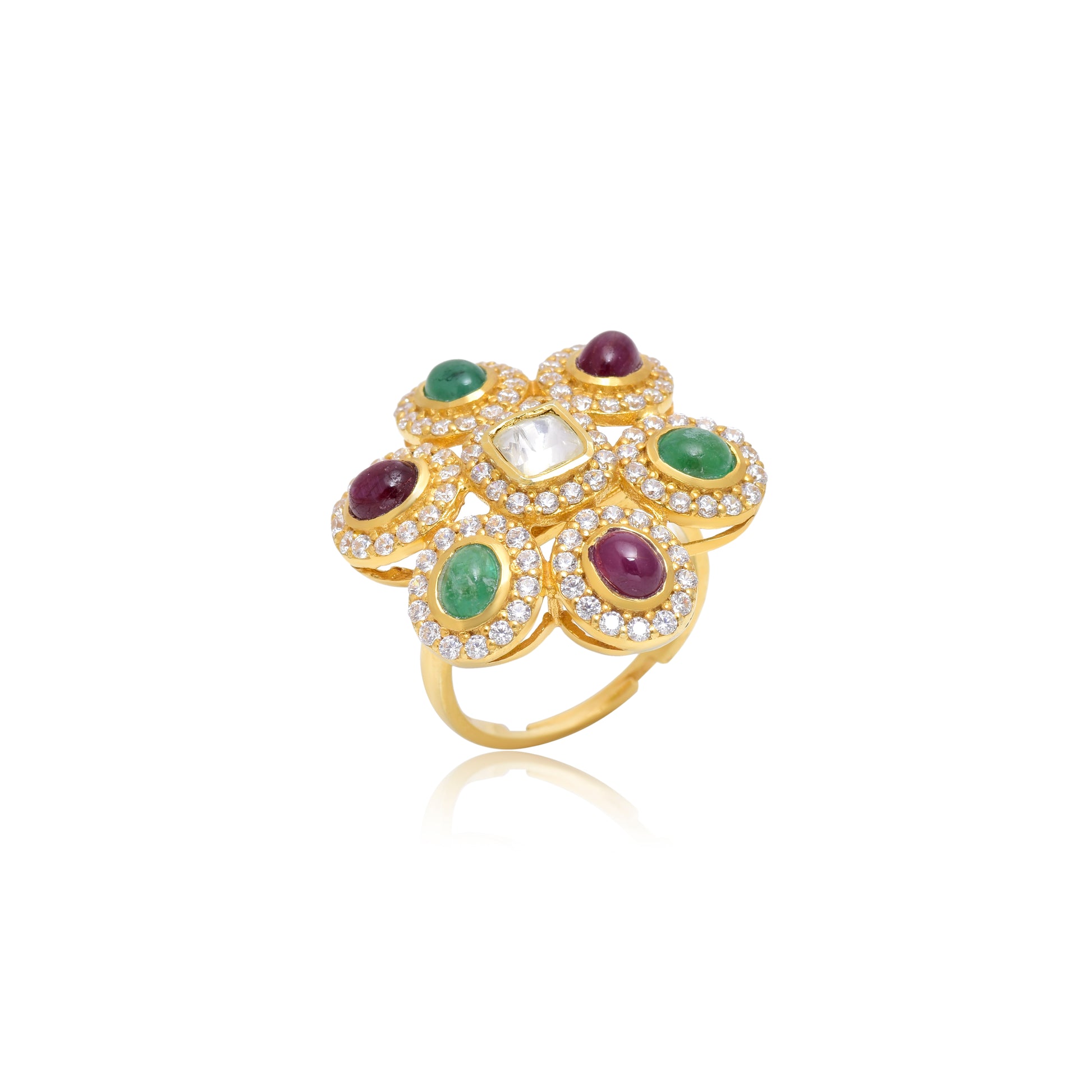Elevate your style with the Moissanite Polki Cocktail Ring, featuring genuine gemstones set in a gold-plated band treated with anti-tarnish protection. Its adjustable design ensures a perfect fit, while the heritage-inspired craftsmanship offers timeless elegance for any occasion. This ring combines durability with classic beauty, making it a refined choice for discerning jewelry enthusiasts.