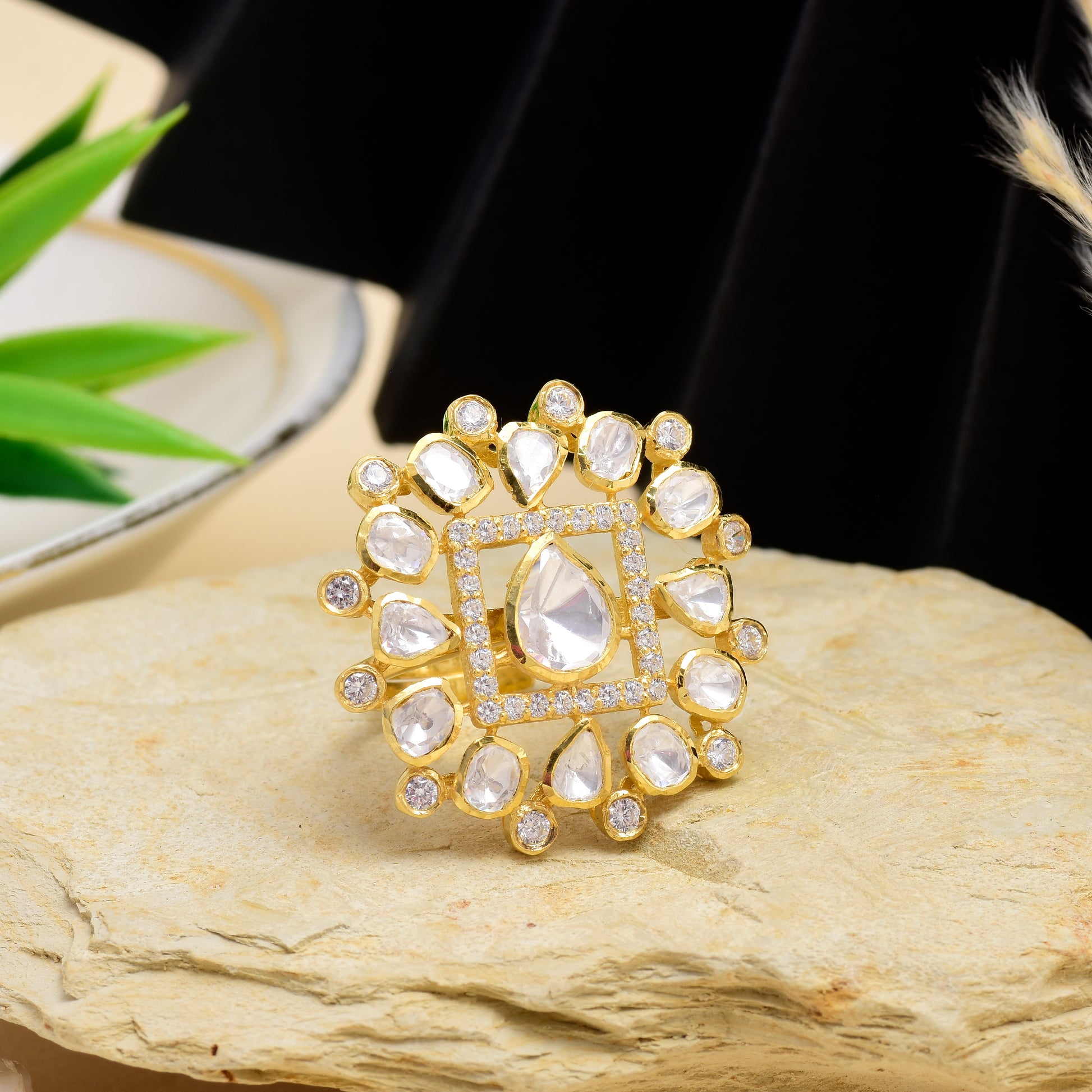 Elevate your style with the Moissanite Polki Cutwork Ring, featuring exquisite gold plating enhanced with anti-tarnish protection for lasting brilliance. Its adjustable design ensures a perfect fit, while the classic cutwork pattern adds timeless elegance, making it an ideal choice for sophisticated party wear. This ring combines durability with refined craftsmanship, offering a luxurious accessory that complements any ensemble with expert finesse.