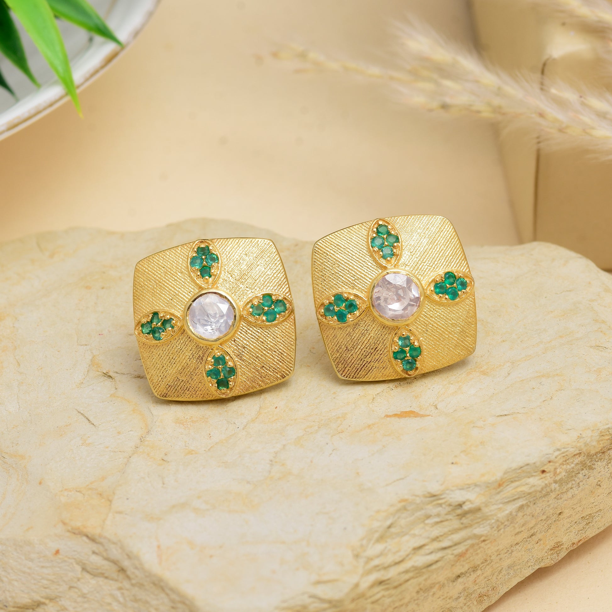 Elevate your everyday style with these Moissanite Polki Green Studs, crafted in sterling silver and finished with a gold polish that resists tarnishing. Featuring a unique design, these earrings combine the brilliance of moissanite with the classic allure of Polki stones, making them a sophisticated choice for daily wear. Durable and elegant, they offer lasting shine and a distinctive touch to any outfit.