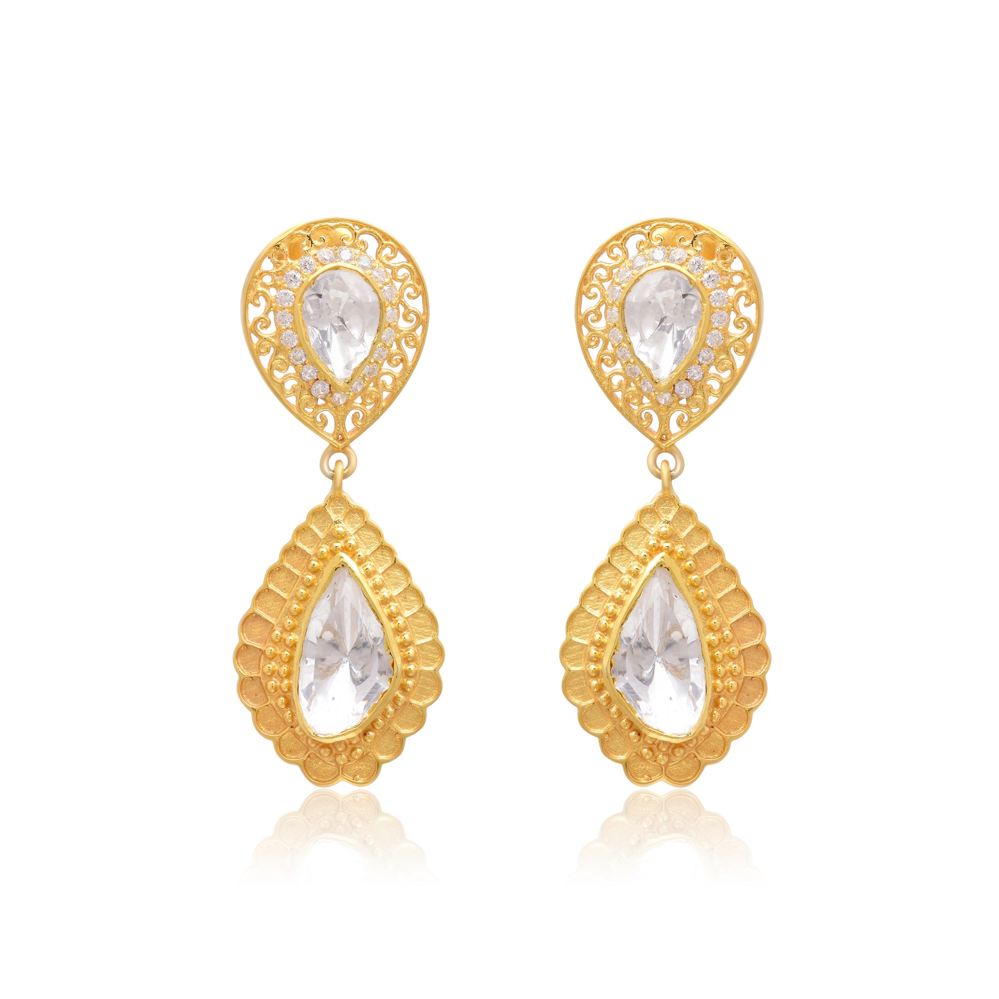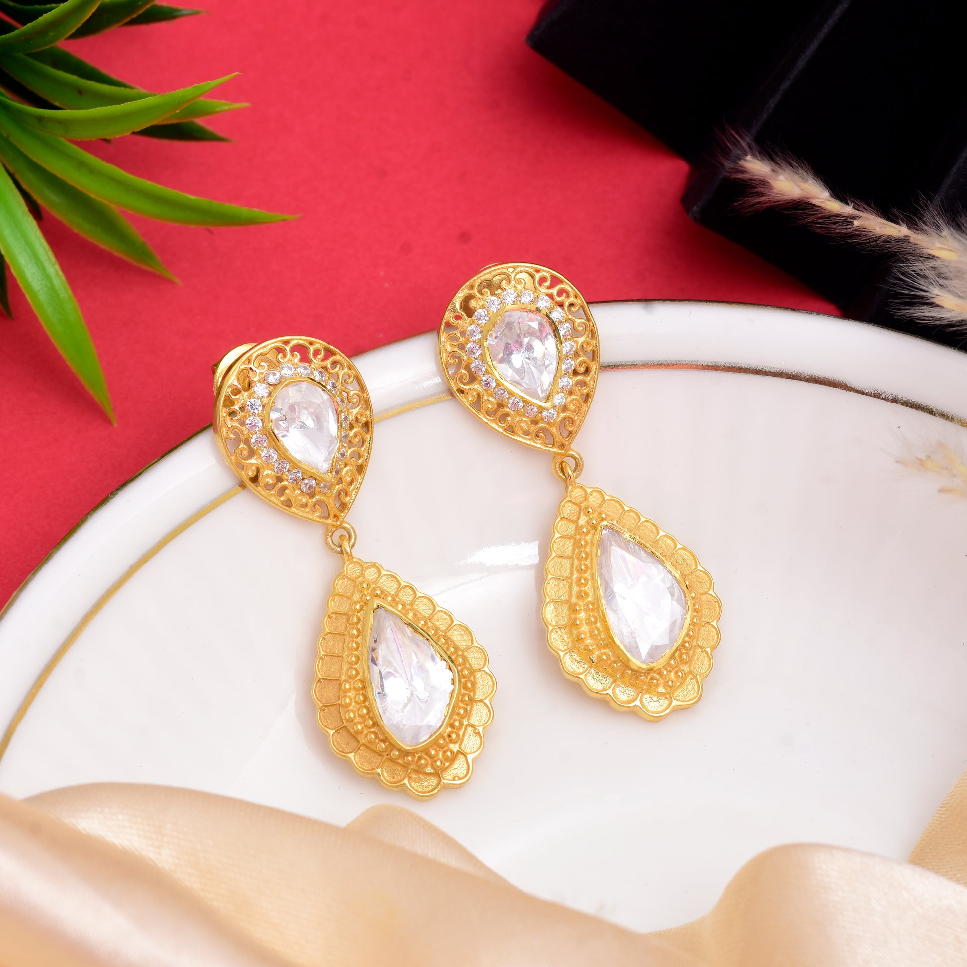 These Moissanite Polki Jaali Work Danglers showcase exquisite handmade cutwork, combining the brilliance of moissanite with the traditional charm of polki design. Crafted in sterling silver and gold plated with an anti-tarnish ultra finish, they offer the rich look of gold while ensuring durability. Perfectly suited for wedding wear, these danglers blend timeless elegance with expert craftsmanship for a sophisticated statement.