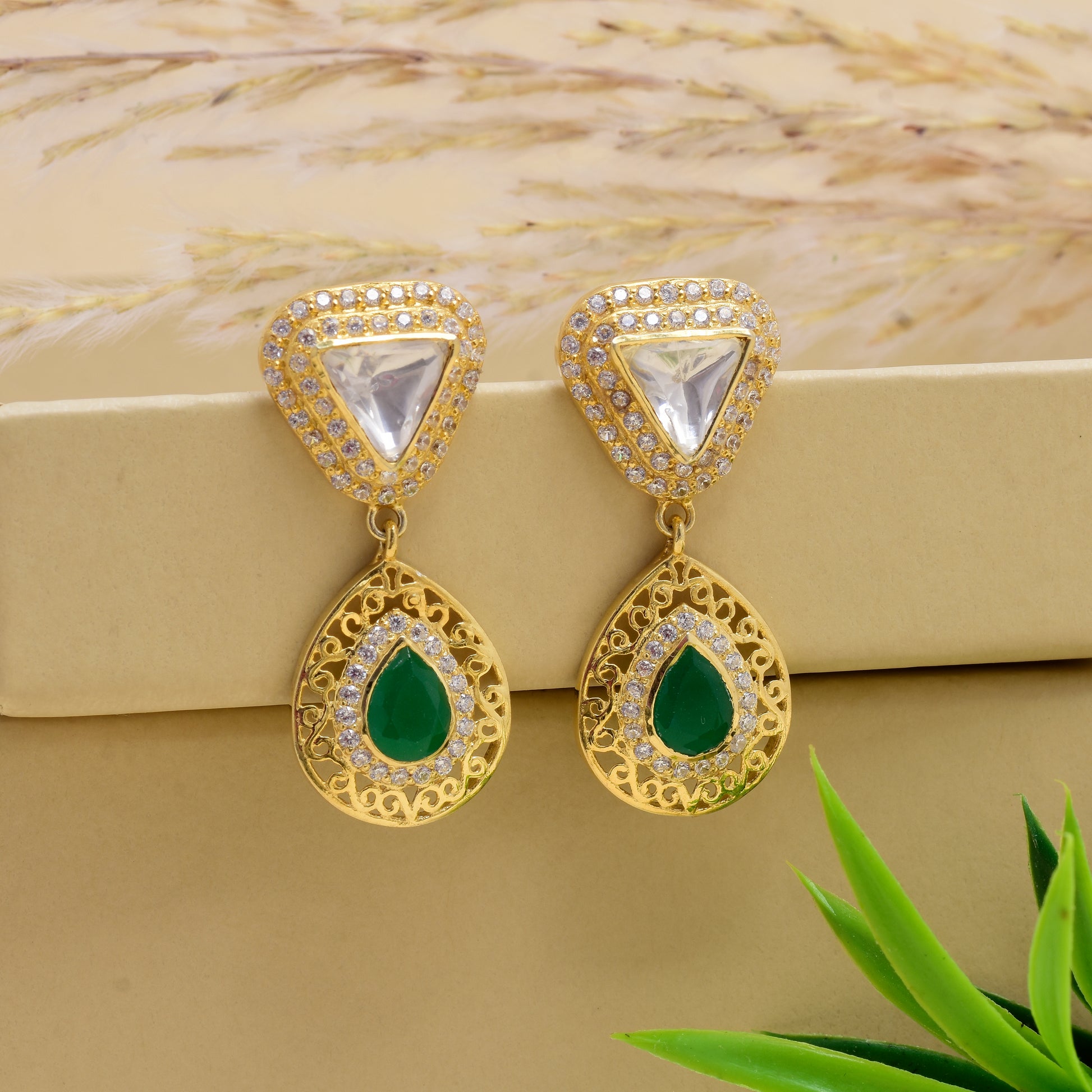 Elevate your ensemble with these Moissanite Polki Jaali Work Earrings, expertly handcrafted to showcase intricate cutwork and a heritage-inspired design. Finished with a luxurious gold polish enhanced by anti-tarnish treatment, these earrings combine lasting brilliance with sophisticated elegance. Perfect for party wear, they bring a refined touch of tradition and luxury to any occasion.