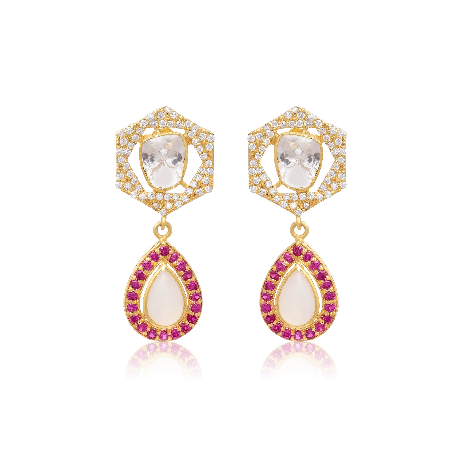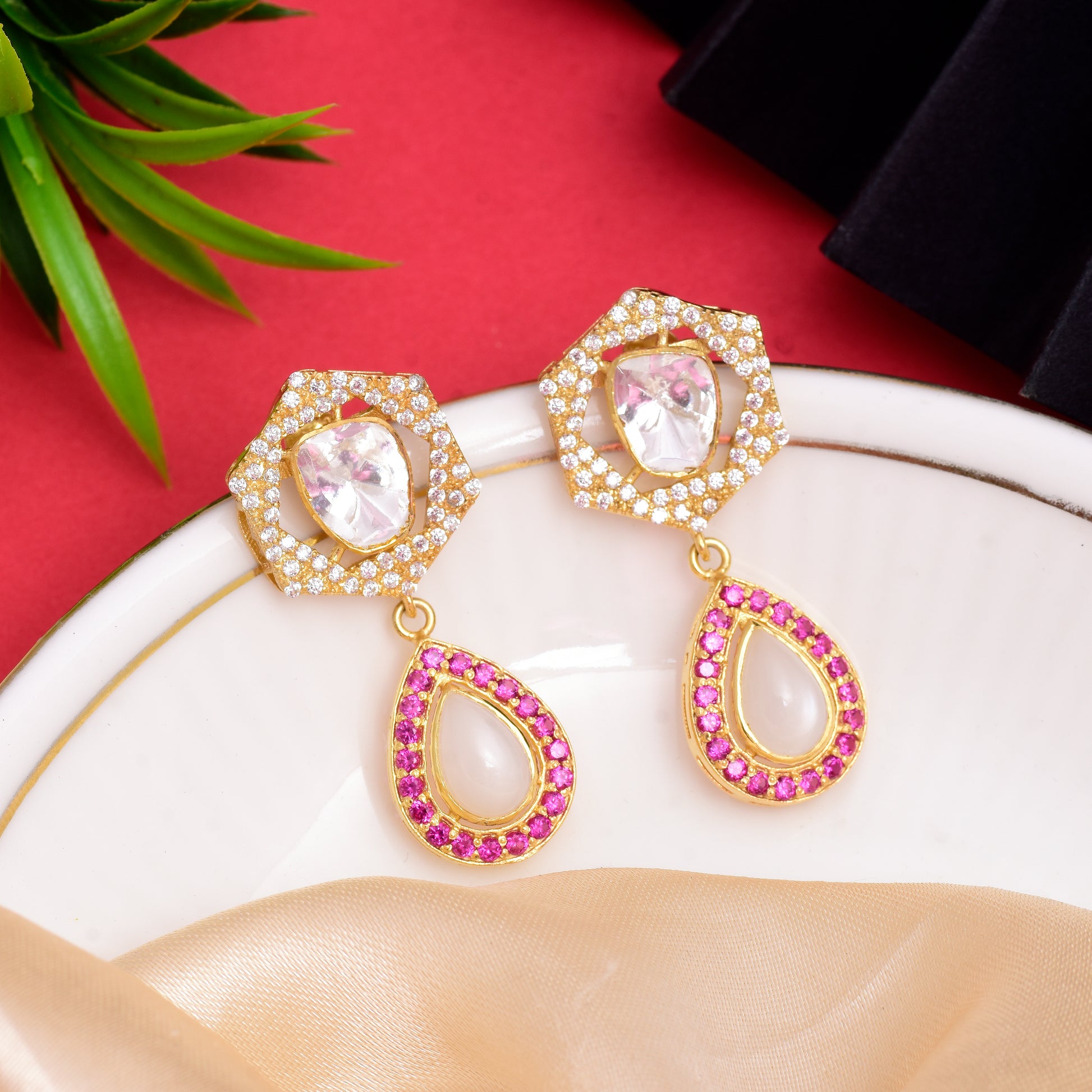 These Moissanite Polki Pearl Earrings combine timeless elegance with durable craftsmanship. Featuring a sophisticated design polished in gold with an anti-tarnish finish, they maintain their radiant shine even after repeated wear. Crafted from sterling silver, these earrings offer both luxury and lasting quality, making them an ideal choice for party wear and special occasions. Their refined style enhances any outfit with a subtle yet striking sparkle.