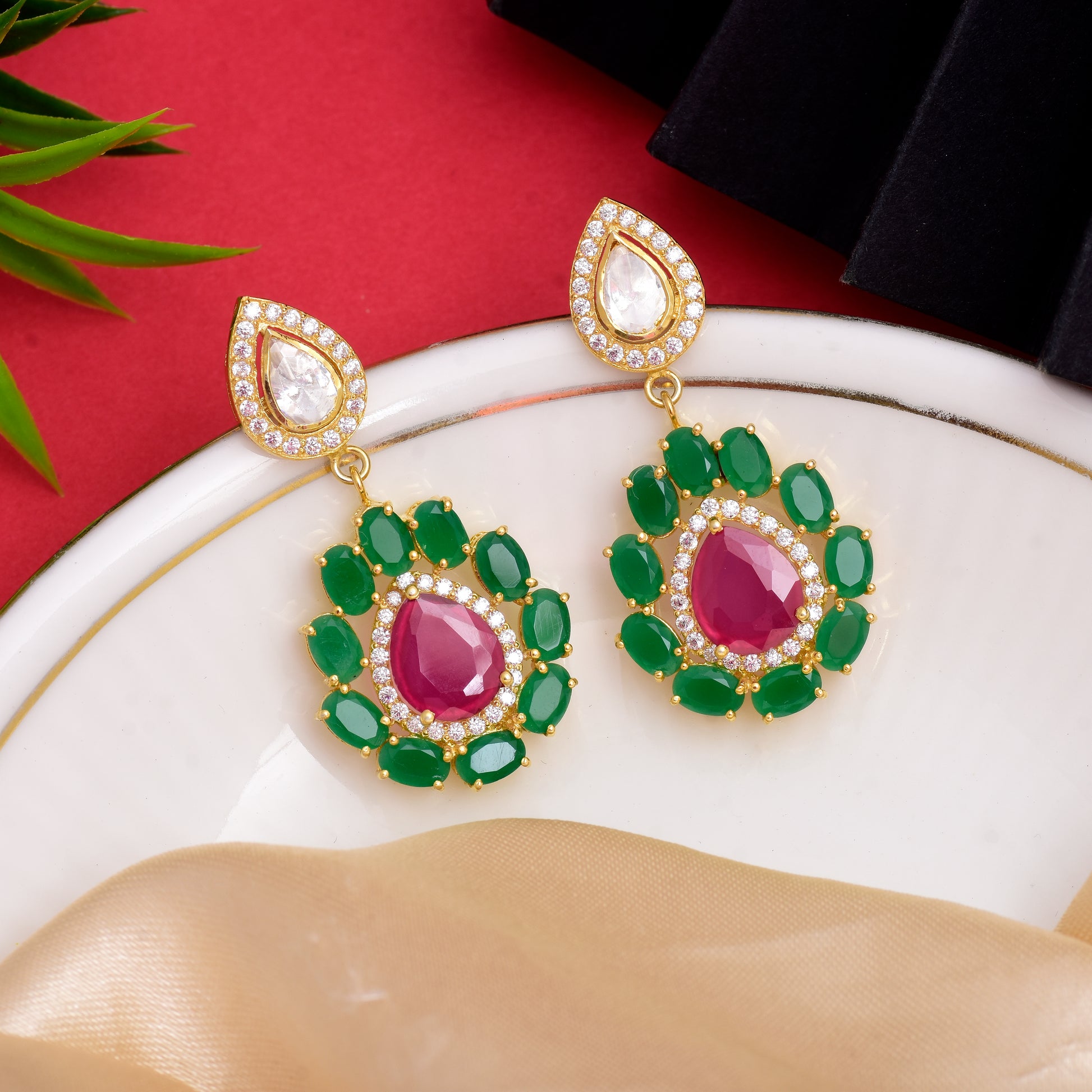 These Moissanite Polki earrings feature a distinctive leaf design that blends heritage charm with a modern aesthetic. Crafted with a gold polish enhanced by an anti-tarnish finish, they maintain their radiant shine over time. The combination of red and green stones adds vibrant color, making these earrings a refined choice for those seeking elegance with lasting durability.