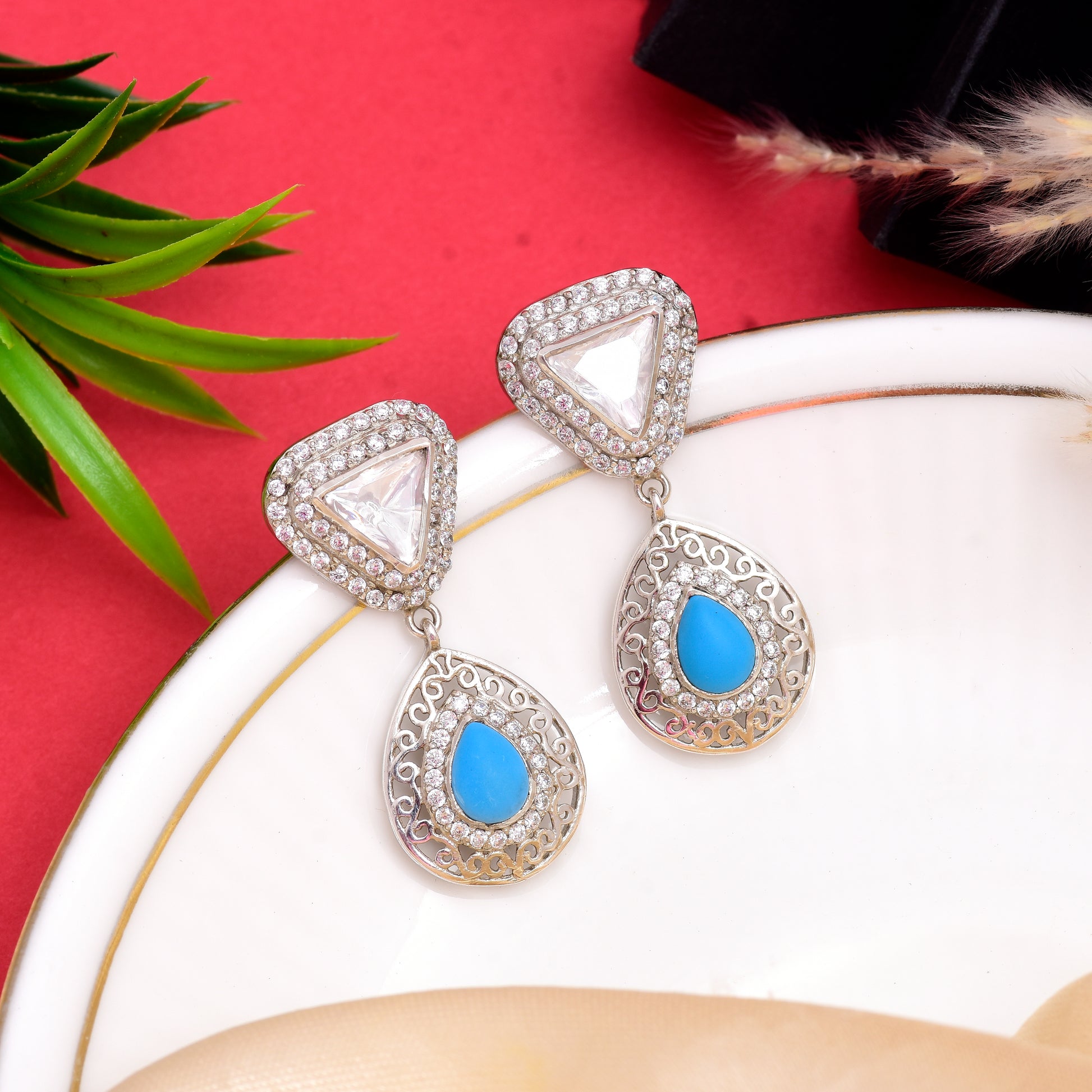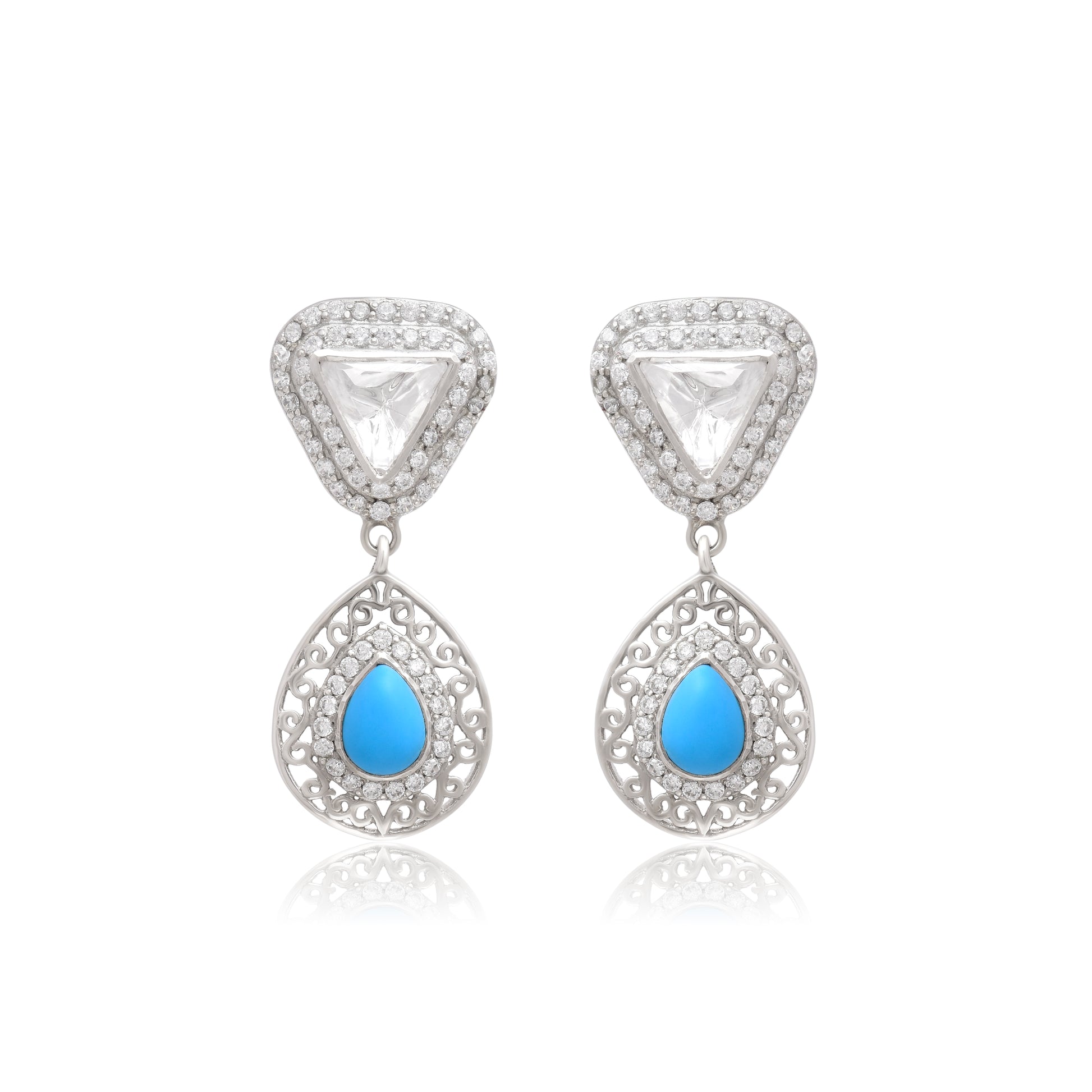 Elevate your elegance with these Moissanite Polki Turquoise Earrings, expertly crafted in white rhodium for a lasting, tarnish-resistant finish. The fusion of classic Polki design and vibrant turquoise stones offers a sophisticated yet contemporary appeal, perfect for those who appreciate timeless beauty with a modern edge.