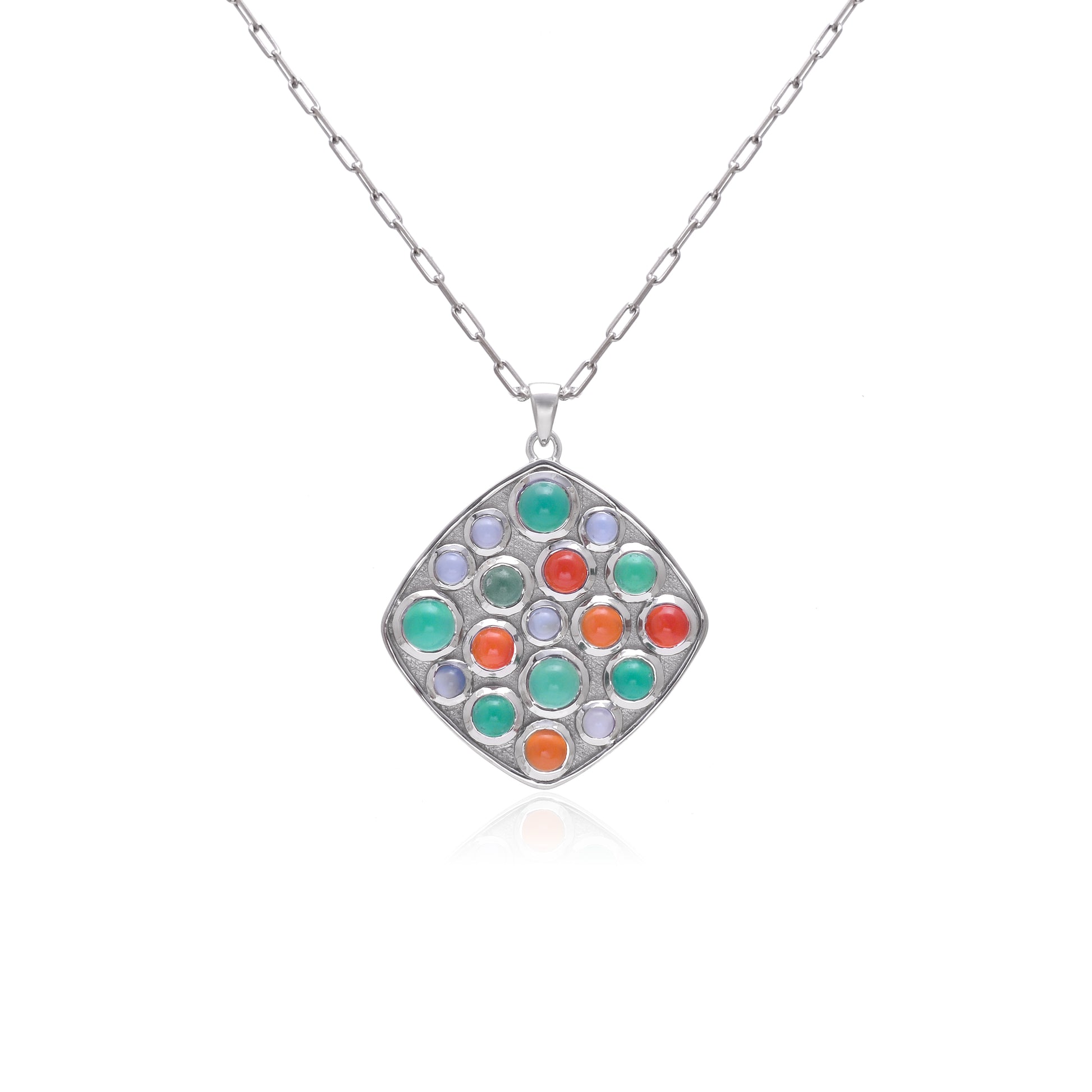 This multicolour round pendant features carefully selected natural semi-precious stones set in white rhodium, offering both elegance and durability. Its anti-tarnish finish ensures lasting shine, making it an ideal accessory for party wear. Combining unique design with luxury craftsmanship, this pendant adds a sophisticated touch to any ensemble.