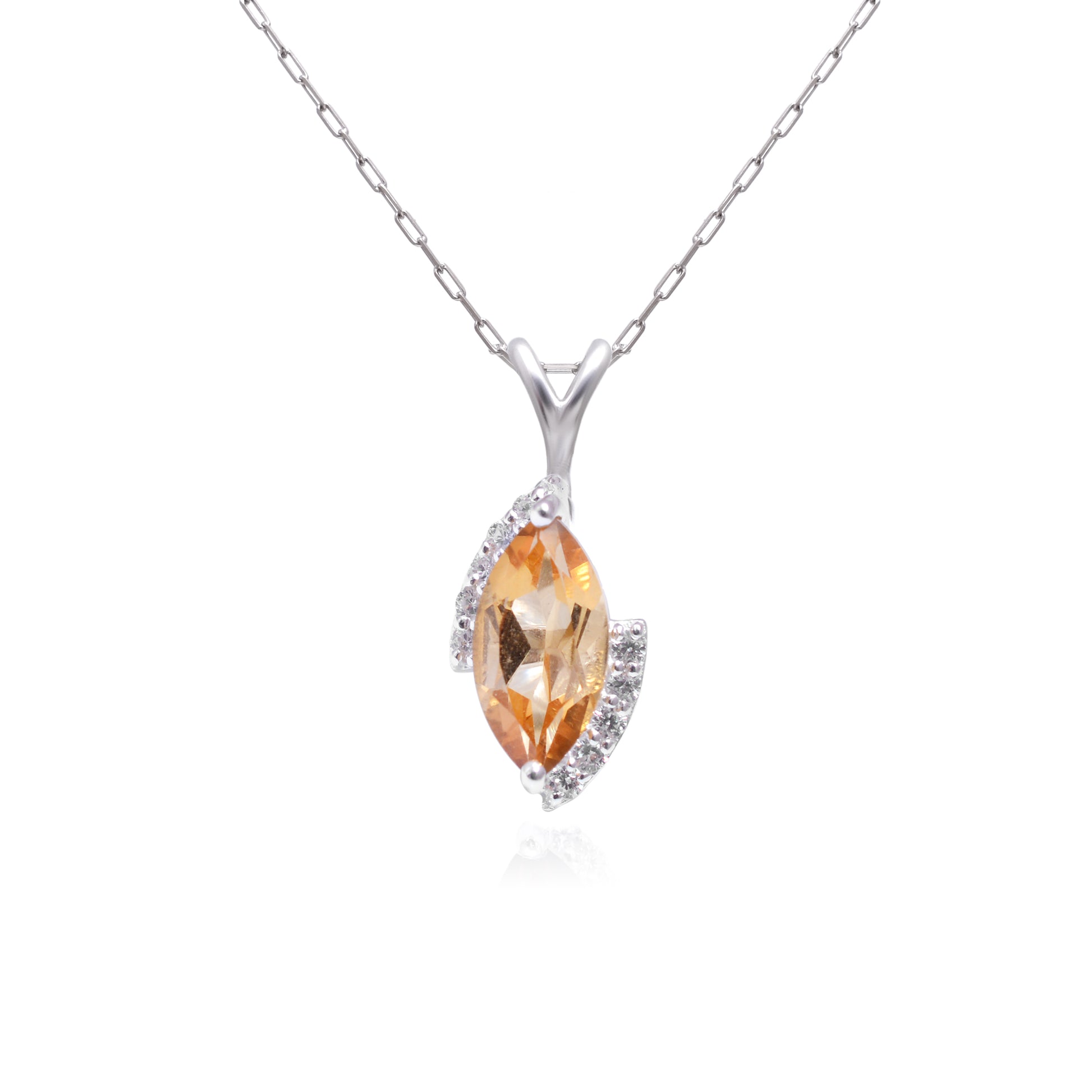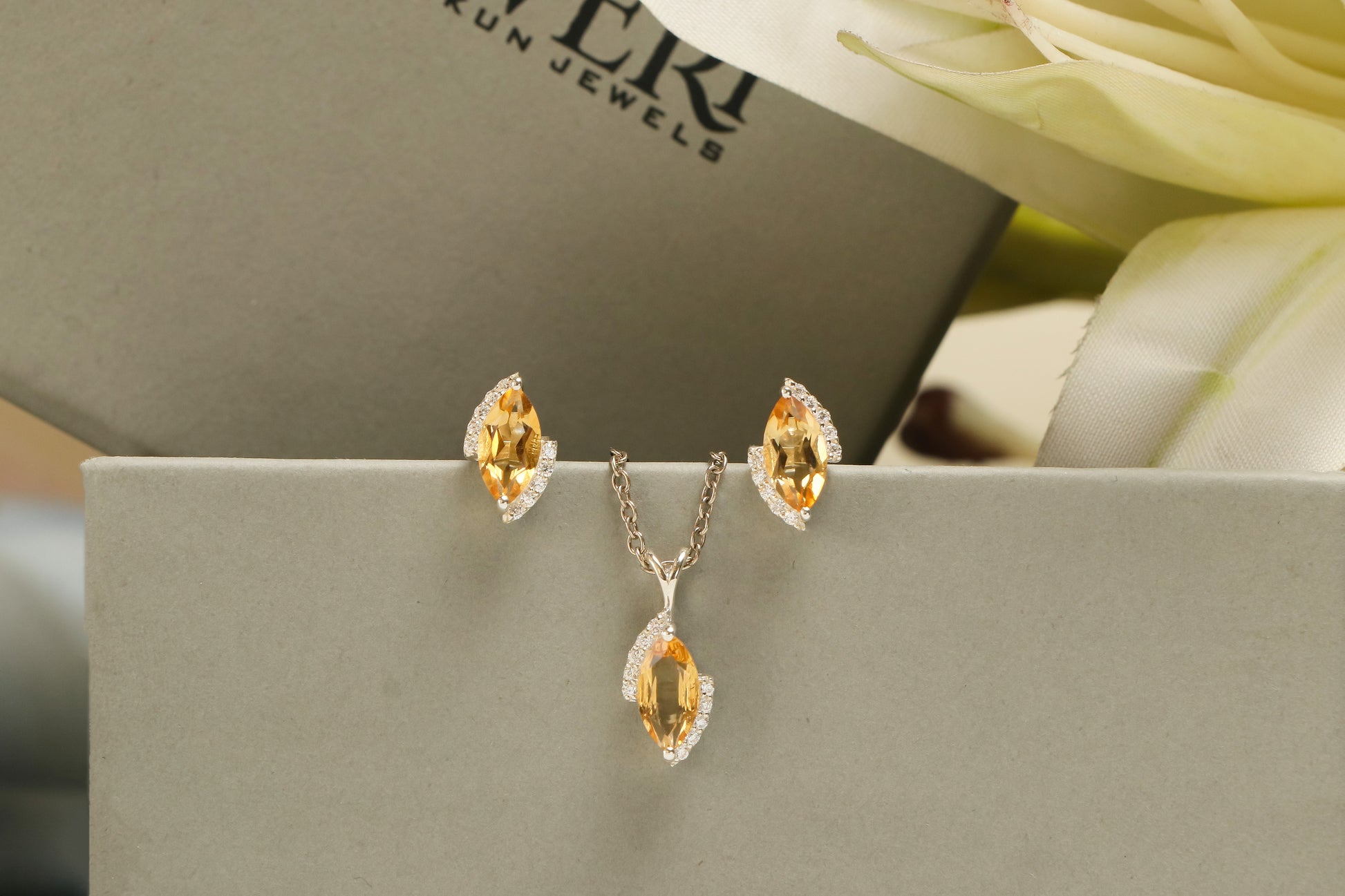 This Yellow Citrine pendant set, crafted in sterling silver and finished with a white rhodium polish, offers a refined yet durable accessory ideal for daily wear and professional settings. Featuring a natural citrine stone, it combines elegance with resilience, making it a sophisticated choice for enhancing your everyday and office attire.